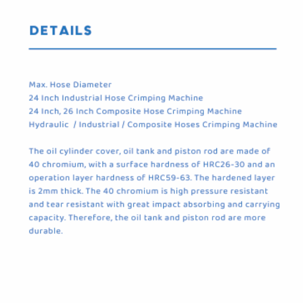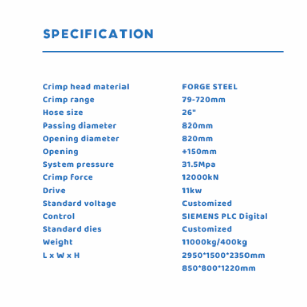 The crimp force of HAMMERSPIR HAM 630 SIEMENS PLC Digital hydraulic hose crimping machine is 12000KN, with a crimp range of 79~720mm. HAMMERSPIR HAM 630 crimpers are widely used for crimping large high-pressure fuel pipes, industrial hoses, large water hoses, automobile air bags and wire ropes etc.