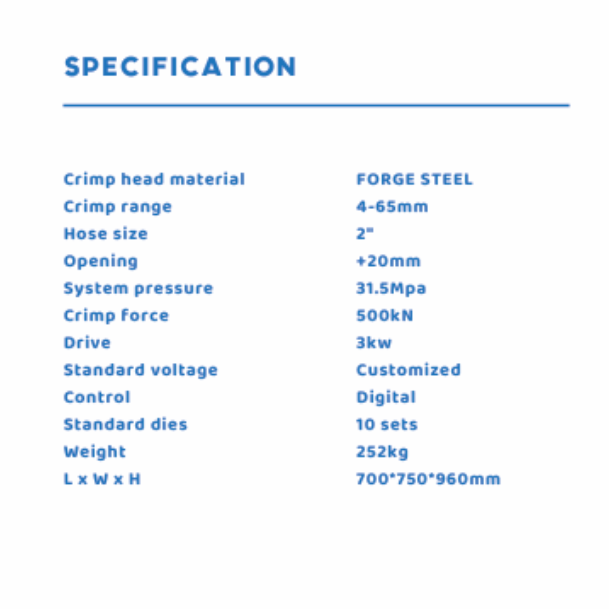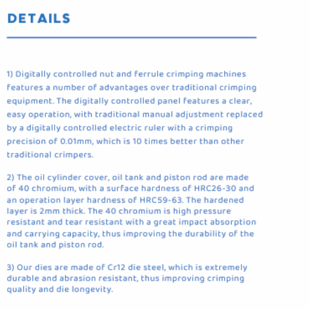 The HAMMERSPIR HAM 80 NC digital controlled nut and ferrule crimping machine is primarily used for attaching the sheath to the connector core, in order to create an integrative connector. The crimp range is 4~65mm, and traditional manual adjustment is replaced by the electrical ruler, with a crimping precision of 0.01mm, which is 10 times higher than that of traditional crimpers.