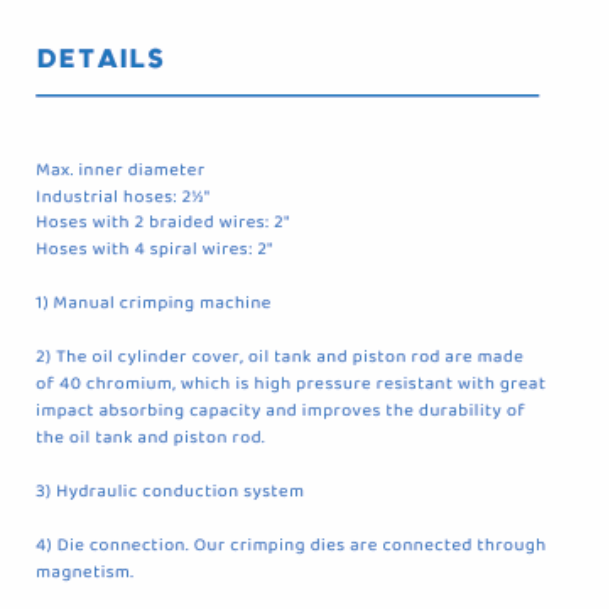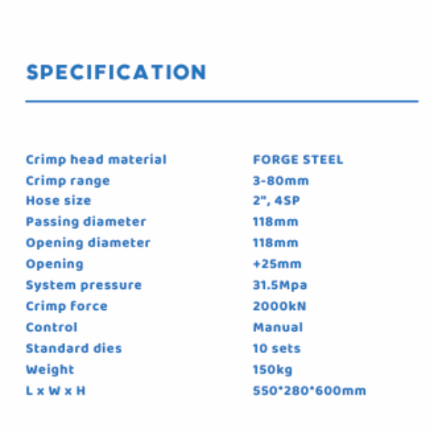 The crimp force of HAMMERSPIR HAM 51S manual crimping machine for hydraulic hose is 2000KN, with a crimp range of 3~80mm and 10 sets of standard dies.